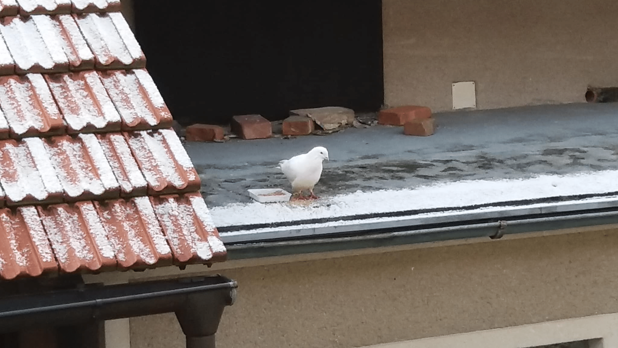 Jak jsem již napsal, holubi se u nás nevyskytují, takže přišla otázka, komu tento albín ulétl? Nevypadá ani nijak vyzáble, že by se krmil pouze odpadky, takže se skutečně může jednat o chovný druh. Na druhou stranu, může mít pouze zimní kožíšek. To posuďte sami.