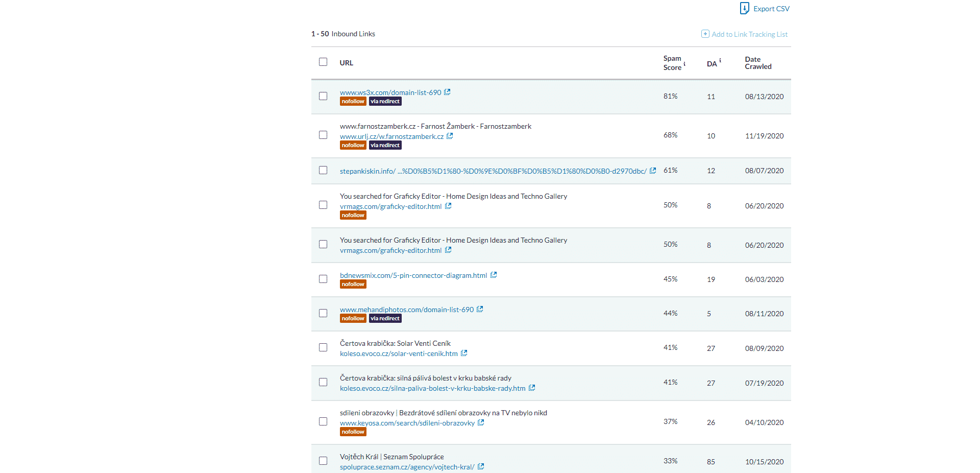 Do něj stačí jednoduše vložit sledovanou doménu, subdoménu nebo adresu konkrétní stránky, a následně poslat k analýze. Výsledkem nám bude graf včetně přesných hodnot a výčtu inbound (příchozích) odkazů. Tento výčet si můžeme stáhnout ve formátu CSV (ve free verzi jsme omezeni na max. 50 položek).