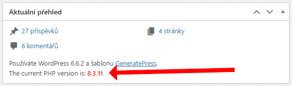 Na snímku výše je vidět informace o PHP generované pomocí WP doplňku PHP Version. Toto je přímo na Nástěnce WP webu.