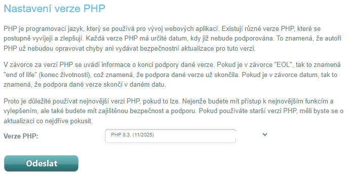 Změnu PHP provedete u svého poskytovatele hostingu během 15 minut. Obvykle se jedná o vratný proces, protože můžete používat nějaké starší doplňky, které novější PHP nepodporují. Osobní zkušenosti s nastavením PHP mám u WEDOS, Savana (nyní Webglobe) a GIGASERVER.