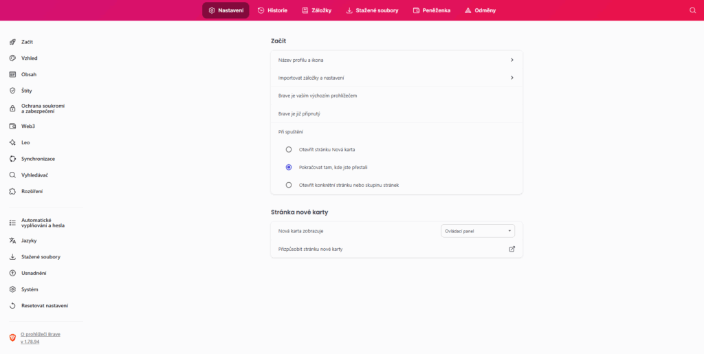 Jelikož prohlížeč Brave vychází ze stejného základy jako Google Chrome, je to zde i stejně nazváno. Avšak tentokrát se to nachází v jiném místě nastavení, hned na začátku. Případně stačí navštívit v prohlížeči brave://settings/.