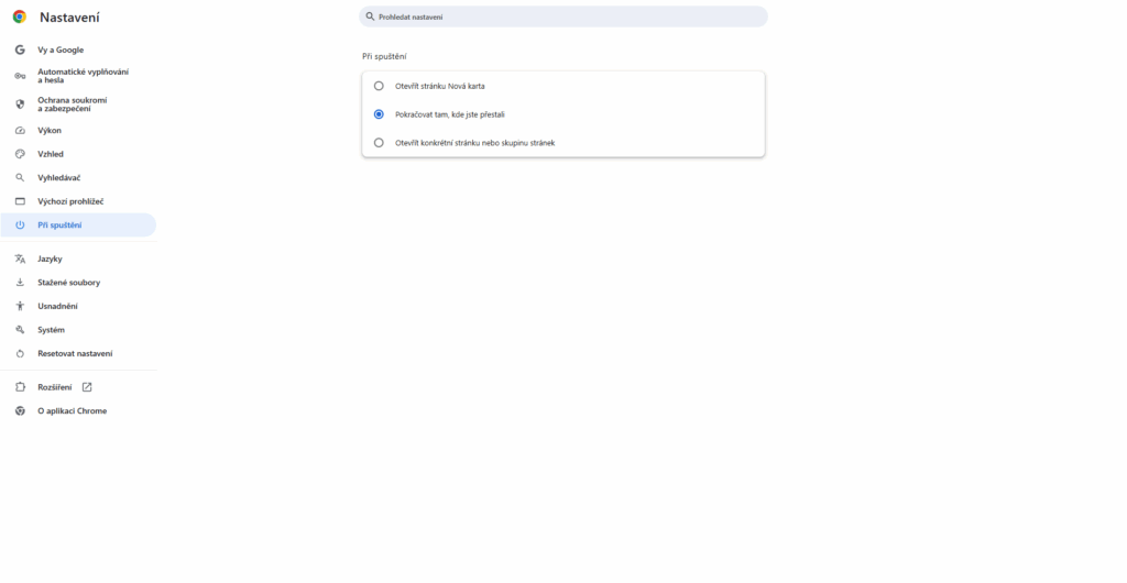 V případě prohlížeče Google Chrome stačí navštívit stránku chrome://settings/onStartup, nebo v Nastavení najít položku Při spuštění.