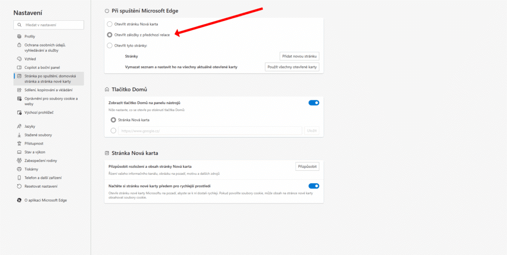 Prohlížeč Microsoft Edge to má na jiném místě a i jinak pojmenované. V jeho případě jde o volbu Otevřít záložky z předchozí relace. Volbu najdete v nastavená stránky po spuštění, nebo jednodušeji pod odkazem edge://settings/startHomeNTP.