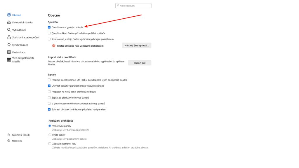 Jako poslední tu mám snímek z prohlížeče Mozilla Firefox. V jeho případě se nastavení nazývá Otevřít okna a panely z minula. Nachází se hned na začátku, nahoře na stránce about:preferences.
