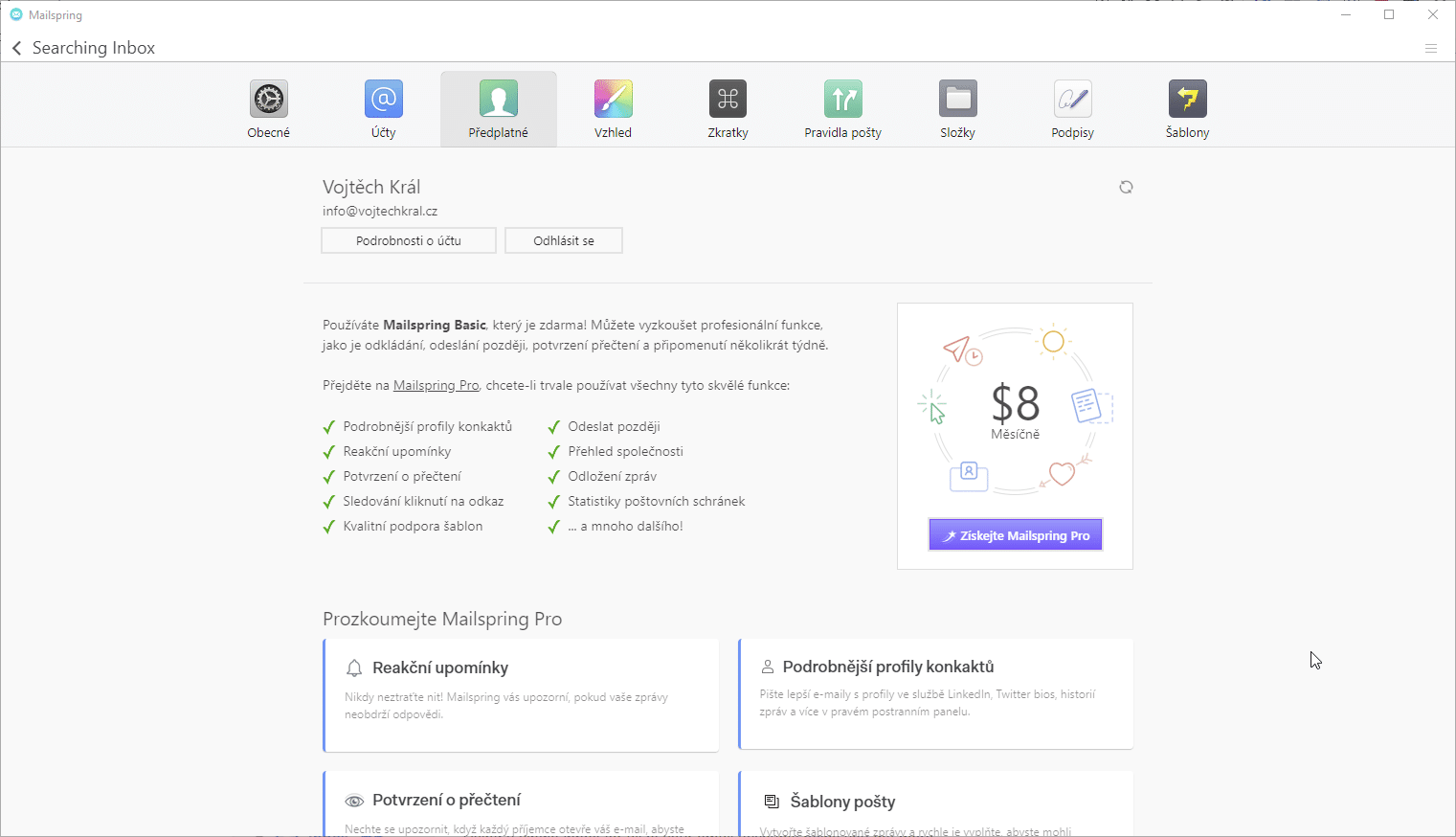 Mailspring je vyvíjen a distribuován jako open source software, takže je zcela zdarma pro každého. Je tedy vhodný i pro komerční užití. Dokonce existuje v placené verzi s cenou $8 měsíčně, ale pro mě je to zbytečné. Je na každým, zda uvedené funkce využije a zda chce podpořit další vývoj nástroje.