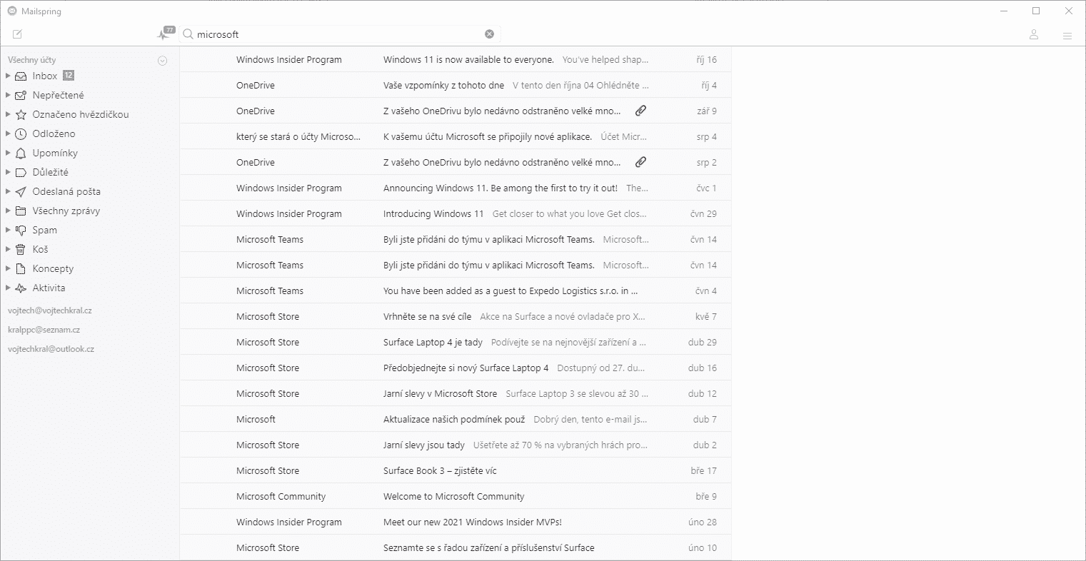 Prvním a velkým přínosem Mailspring je podpora více účtů, multiple accounts. Znamená to, že v jediném programu máte e-mail od Google, Microsoftu, Seznamu atd. Zcela tak eliminujete nutnost přepínání mezi okny a poštovními správci. Vše máte hezky pohromadě.