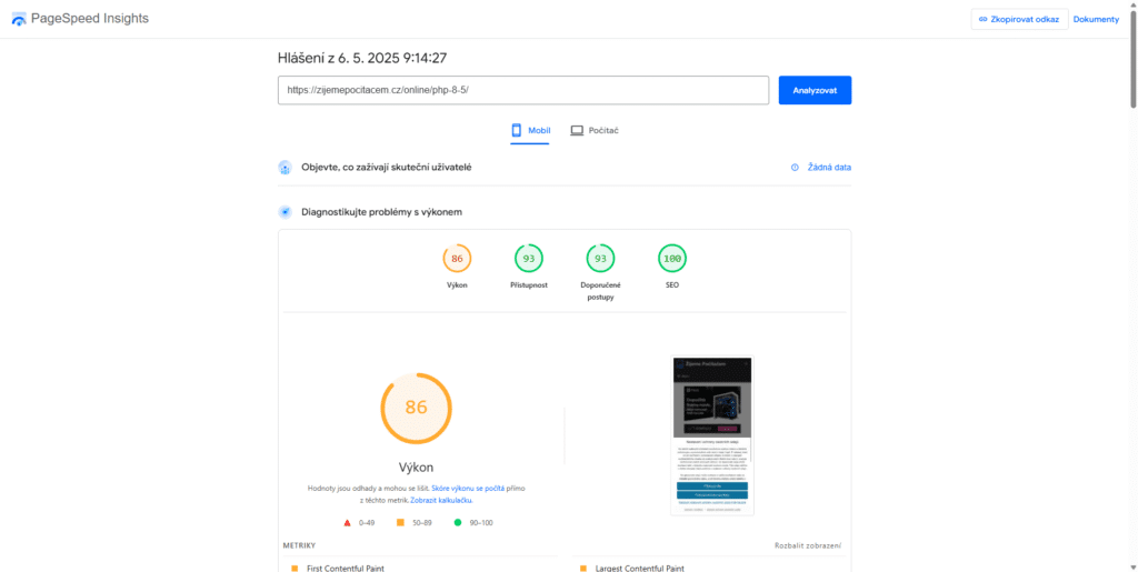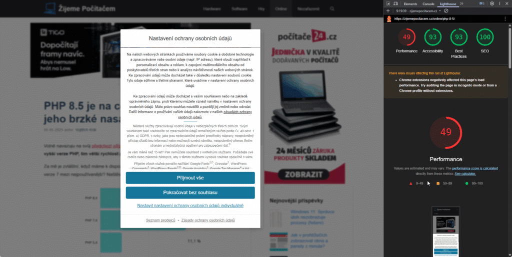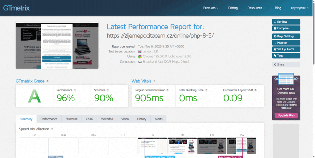 Na svém příspěvku https://zijemepocitacem.cz/online/php-8-5/ jsem se rozhodl otestovat nástroje Pagespeed Insights, Lightbox (dostupný v prohlížeči) a GTmetrix, abych ukázal rozdíly ve výsledcích a interpretaci.
