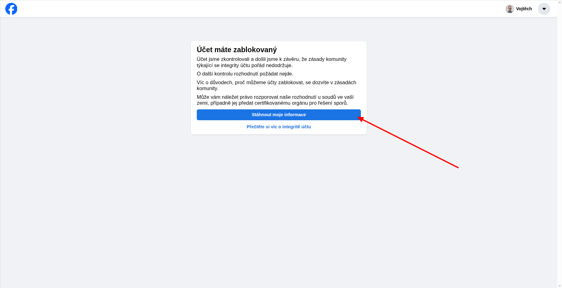 Jediné použitelné tlačítko je "Stažení mých informací", ale kupodivu ani to nefunguje. Po kliknutí na něj se dostanu na prázdnou stránku s adresou https://www.facebook.com/checkpoint/dyi/?referrer=disabled_checkpoint