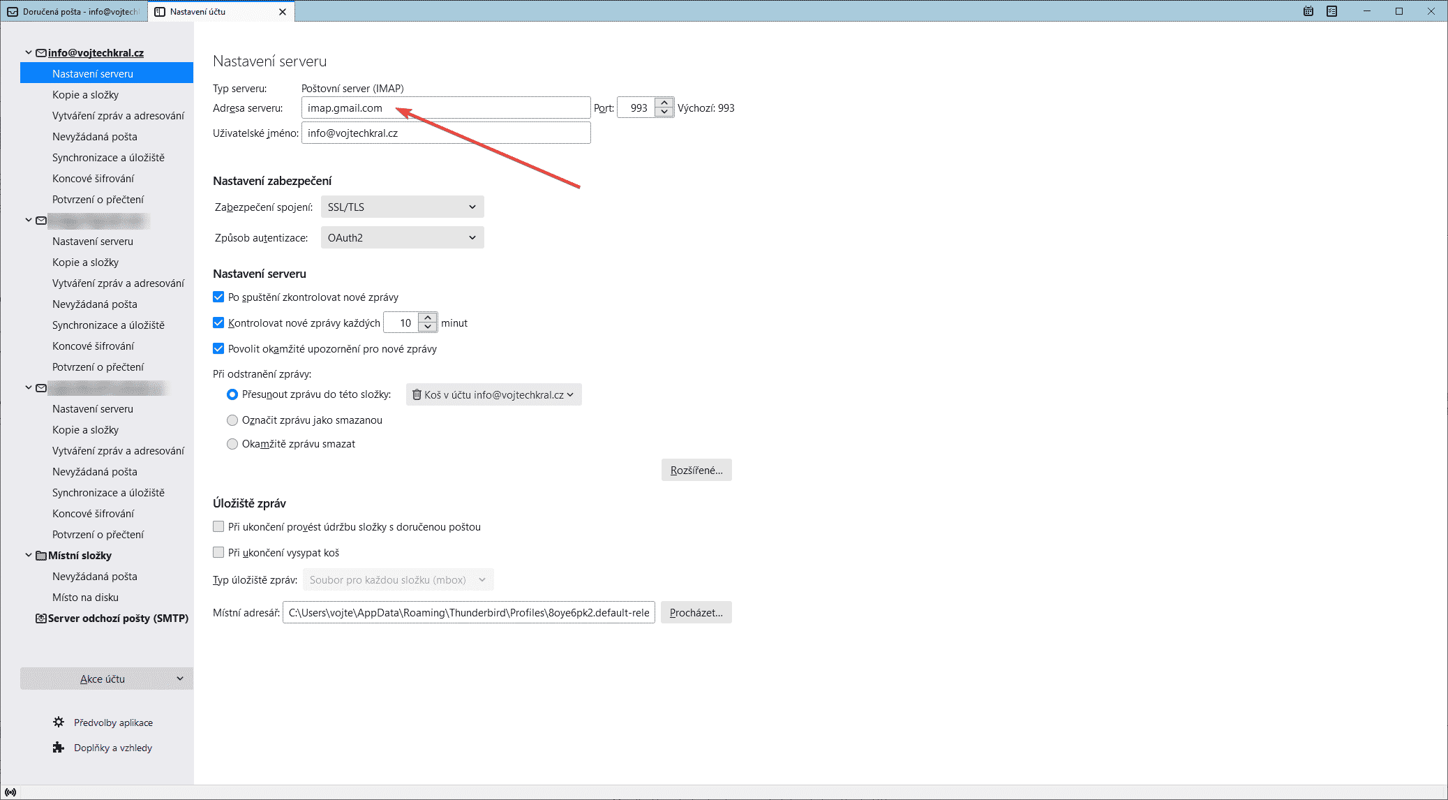 Zda používáme IMAP protokol si můžeme zkontrolovat přímo v Mozille v sekci Nastavení účtu => Nastavení serveru v poli s adresou serveru.