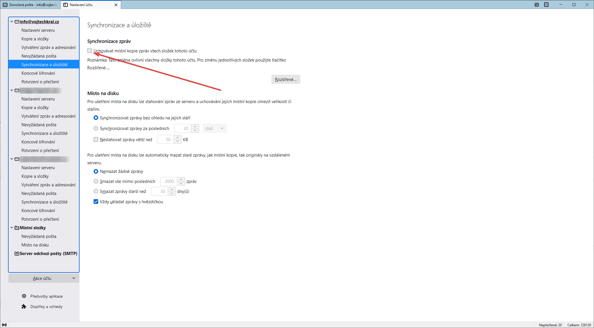 Nyní nás čeká rychlé vypnutí synchronizace zpráv v samotném klientovi. Rychlé proto, protože jakmile Mozillu Thunderbird znovu spustíme, ihned se začnou stahovat všechny zprávy ze serveru, což nechceme. Takže ihned po spuštění přejdeme do Nastavení účtu => Synchronizace a úložiště, kde stačí zrušit zátržítko uchovávání místní kopie zpráv.