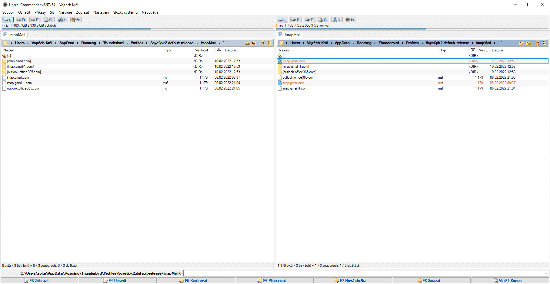 Nyní přijde na řadu vyčištění/smazání stažené pošty, což je nejjednodušší provést třeba pomocí dvouokenního správce souborů Unreal Commander. V něm si najdeme složku s uloženým profilem pošty (obvykle složka Users=>“jméno“=>Data aplikací(AppData)=>Roaming=>Thunderbird=>Profiles=>“název profilu“=>ImapMail. Zde bude mít každý poštovní účet svou složku a MSF soubor. Je potřeba oboje smazat. Tím nesmažene uložené údaje o účtu (nastavení serveru, heslo apod.), ale pouze stažené zprávy.