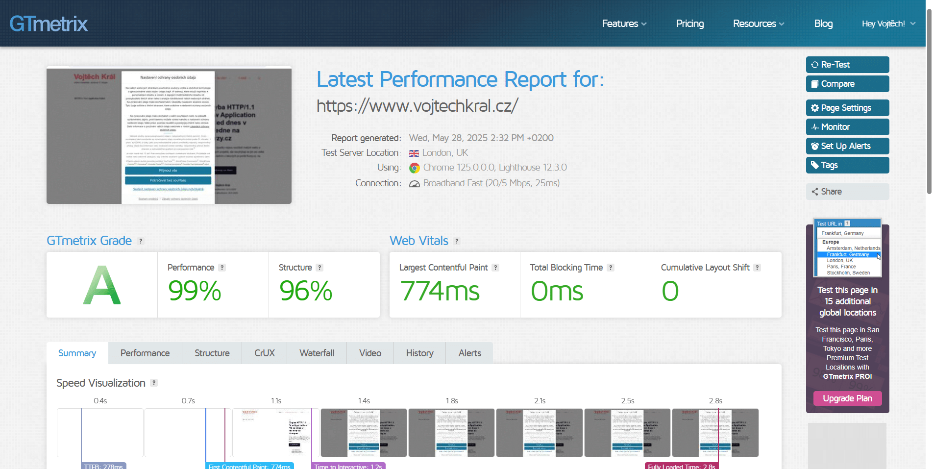 GTmetrix patří mezi nejoblíbenější a nejpřesnější analyzátory rychlostí internetových stránek. Má testovací servery po celém světě, takže může nabídnout skutečně relevantní údaje a hodnoty.