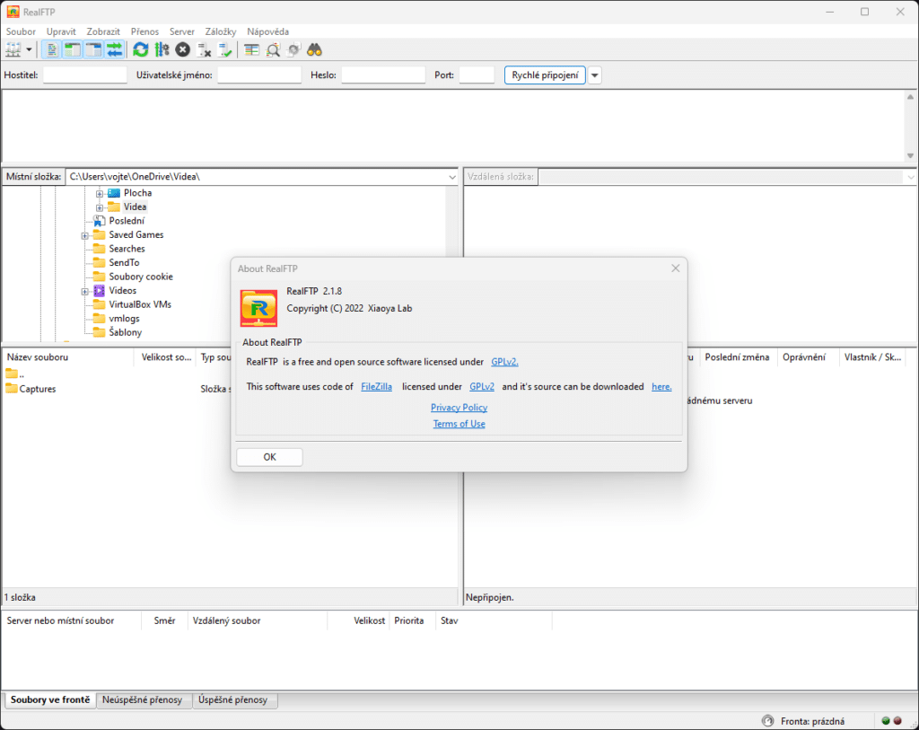 Až později jsem se podíval do nápovědy, kde je uveden rok vzniku 2022, copyright Xiaoya Lab a informace o používaném kódu FileZilla. RealFTP je tedy souborový protokol vytvořený pro Microsoft Store.
