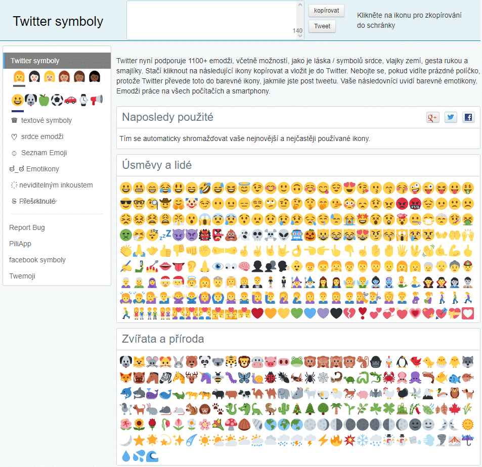 Na stránce se nachází smajlíci nejen pro Facebook, ale pomocí levé postranního menu se můžete přepnout na Seznam emoji, Twitter symboly a další. Nezapomínal bych, že společnost Facebook je držitelem sítě WhatsApp, takže by emotikony měly být totožné.