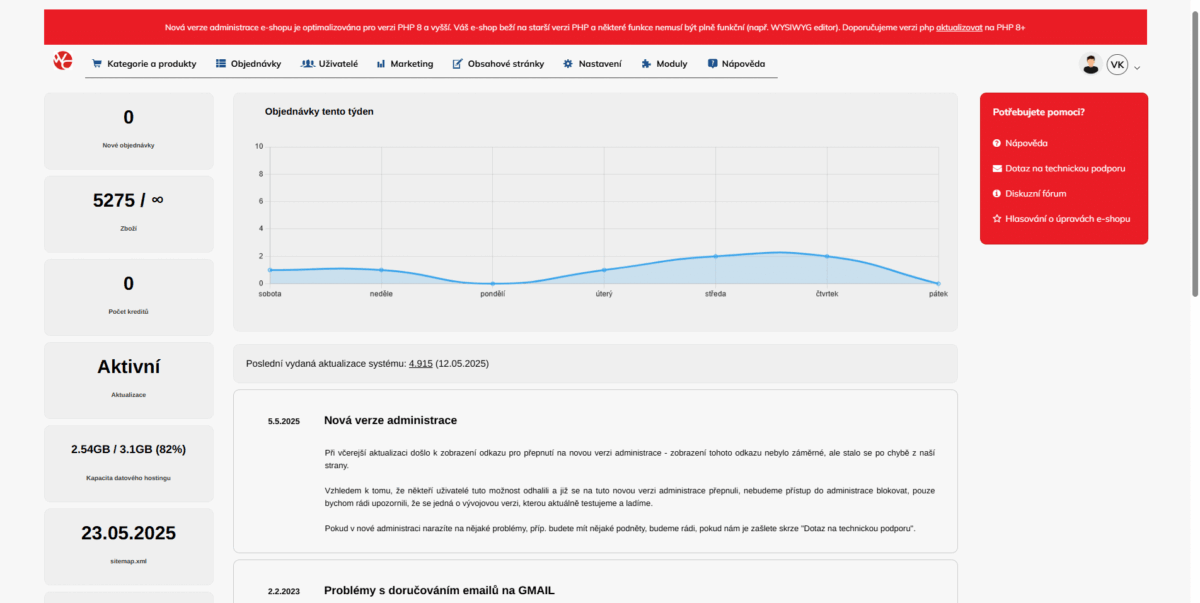 WebCzech e-shopy jsou čistě programované v PHP a primárně používají stabilní verzi 7+. Nová administrace je však optimalizována pro vyšší PHP 8+ (červená hláška nahoře).