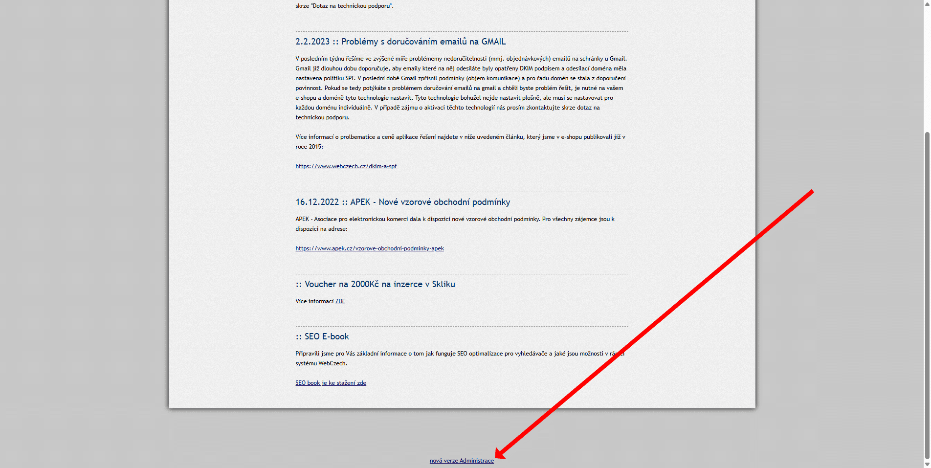 Na nové rozhraní se můžete přepnout z kterékoliv stránky administrace nevýrazným odkazem úplně vespod.