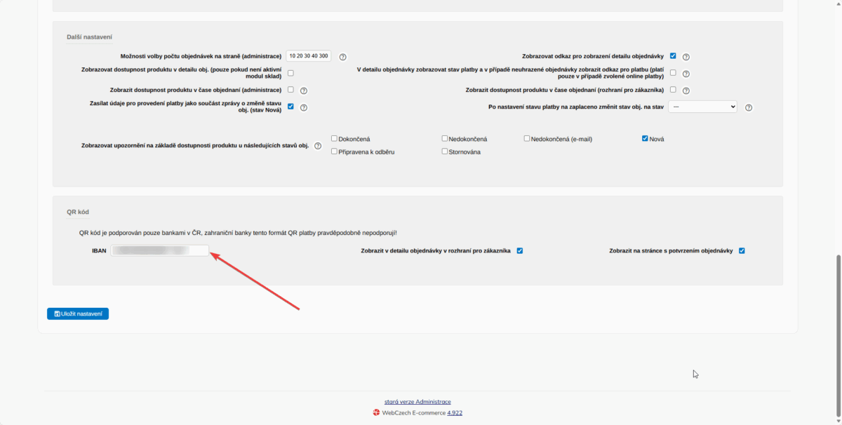 E-shopové řešení Webczech touto funkcí disponuje také, ale musíme ji nastavit. Nestačí ji pouze povolit a zadat číslo účtu. Je potřeba zadat IBAN příjemce. Bez jeho zadání je QR kód generovat nebude.