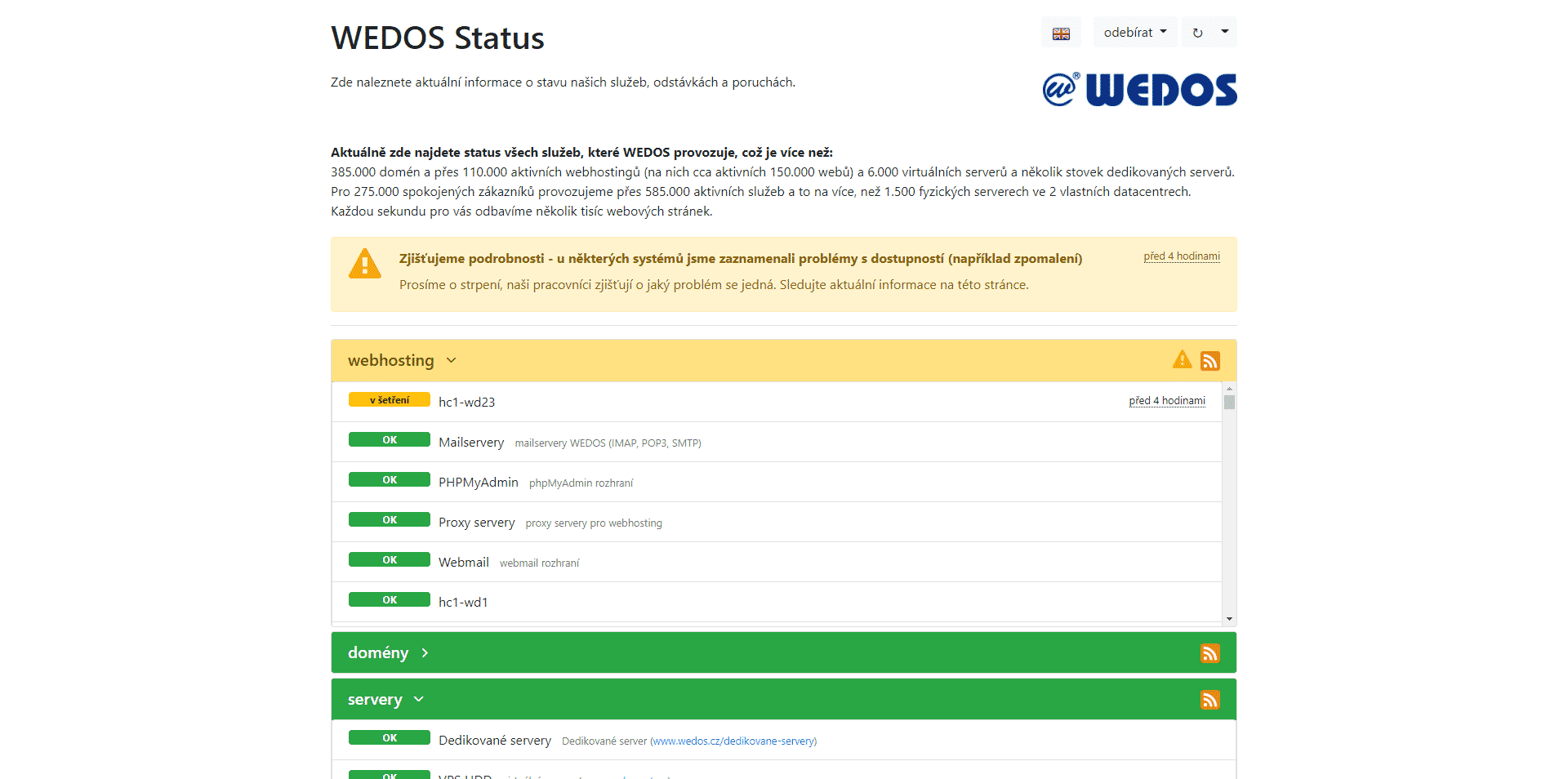 Aktuální informace o stavu, odstávkách, poruchách najdete ve WEDOS statu