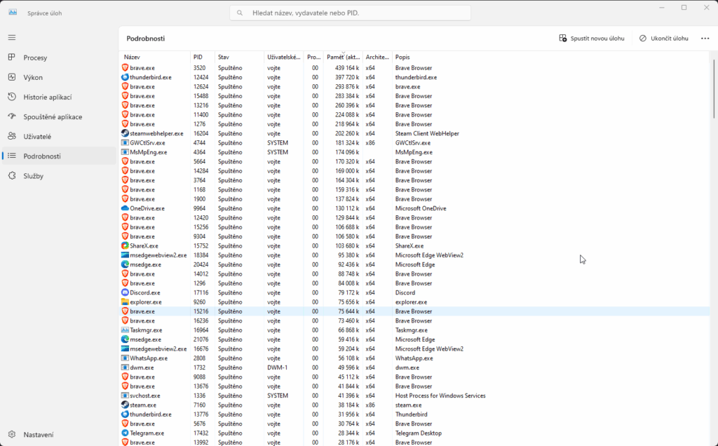 Hodnoty v jednotlivých sloupcích můžete řadit (v mém případě dle využití paměti). Podle ikony, názvu nebo popisu snadno poznáte, o jaký program se jedná. Využití procesoru zde najdete také (vlevo od paměti).
