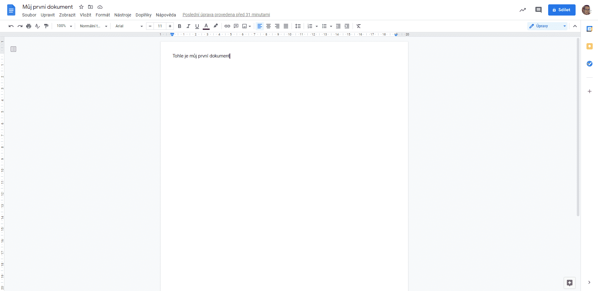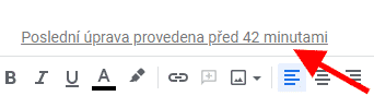 Důležitou změnou od „kamenný wordů“ je absence tlačítka Uložit. To tu nikde nenajdete. Protože pracujeme s dokumentem v cloudu a jsme připojeni k internetu, ukládání probíhá automaticky. Stačí cca 2 vteřiny nic nenapsat a dokument se sám od sebe uloží. Kdy by takto dokument naposledy uložen/zeditován, naleznete vpravo od záložky Nápověda.