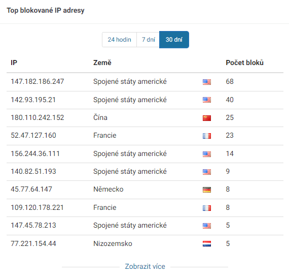 Mimo jiné mám ve statistikách Wordfence údaje o blokovaných IP adresách a zemích, ze kterých tyto adresy přišly. Nepoužívám geografická omezení, takže mám weby přístupné odkudkoliv.