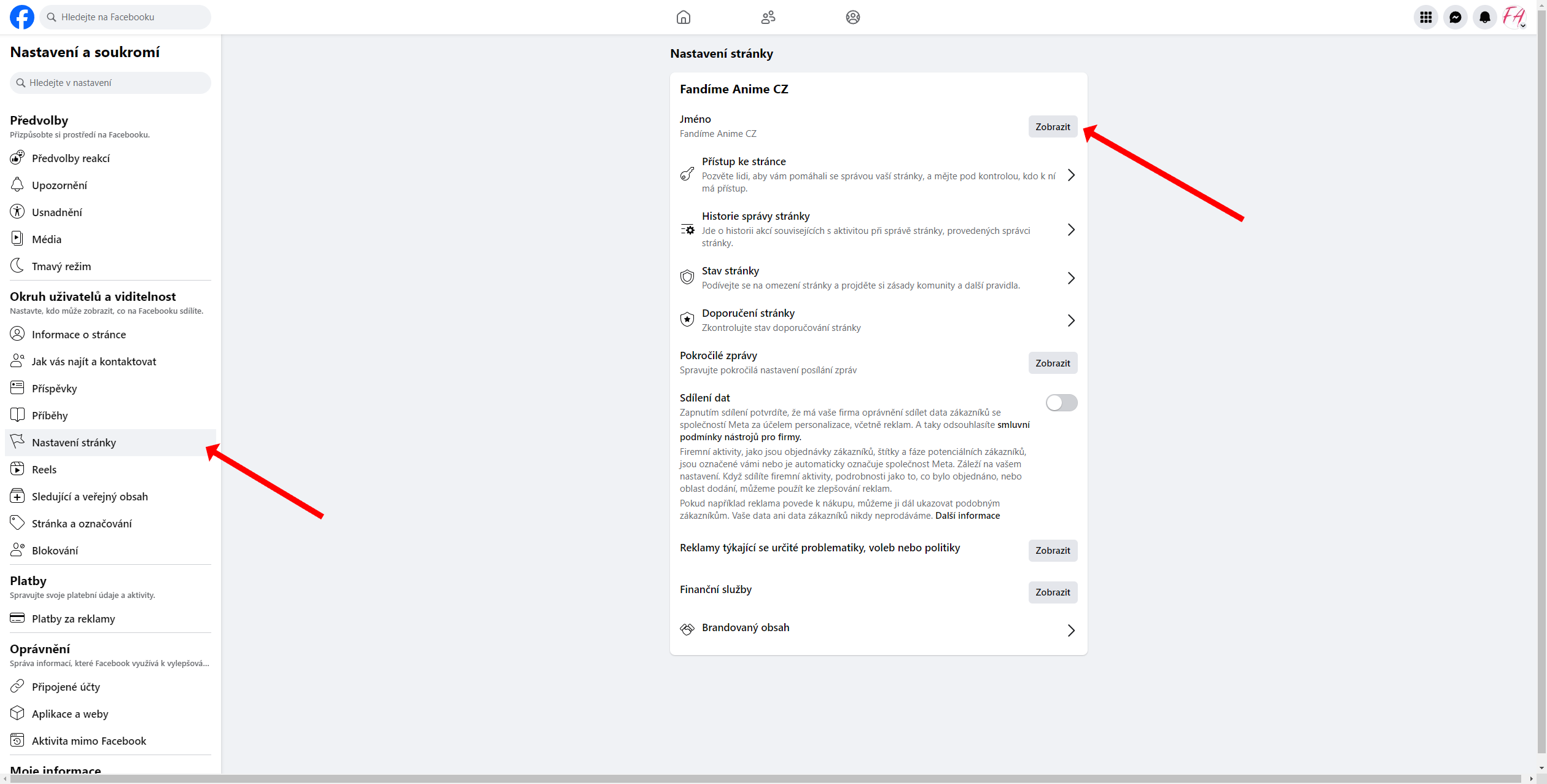 Dále pokračujeme do položky Nastavení stránky (opět v levé nabídce), kde zvolíme zobrazení jména tlačítkem Zobrazit.