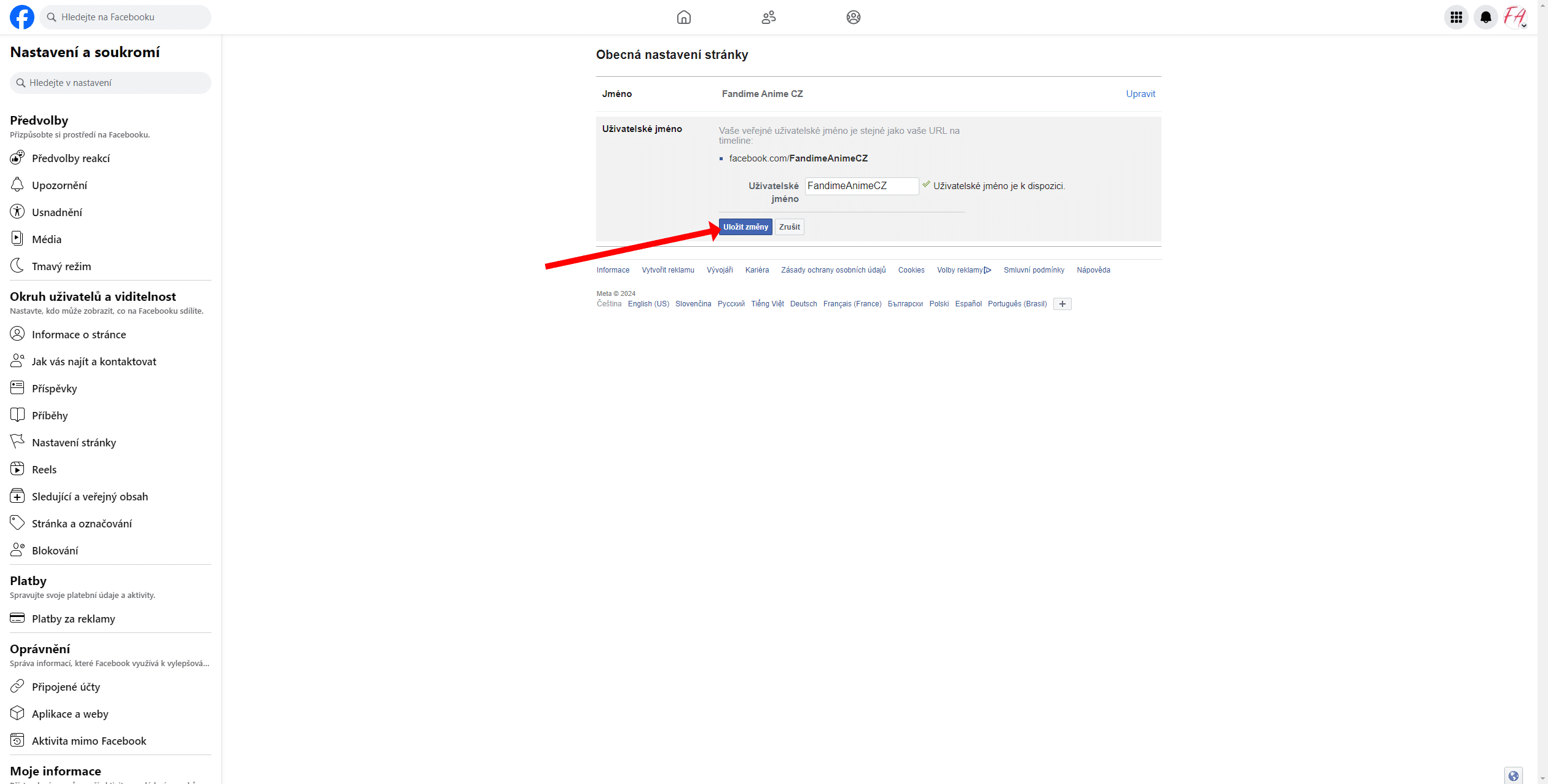 Jméno je název Facebook stránky, Uživatelské jméno je adresa stránky ve tvaru (www.facebook.com/<Uživatelské jméno>). Zde můžeme uživatelské jméno (adresu) upravit a hned se také dozvíme, jestli už není obsazená.